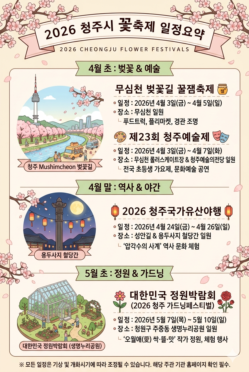 #2026청주벚꽃축제 #청주봄축제일정 #무심천벚꽃개화시기 #청주가드닝페스티벌 #대한민국정원박람회 #청주야행 #청주가볼만한곳 #무심천푸드트럭 #청주데이트코스 #청주벚꽃실시간