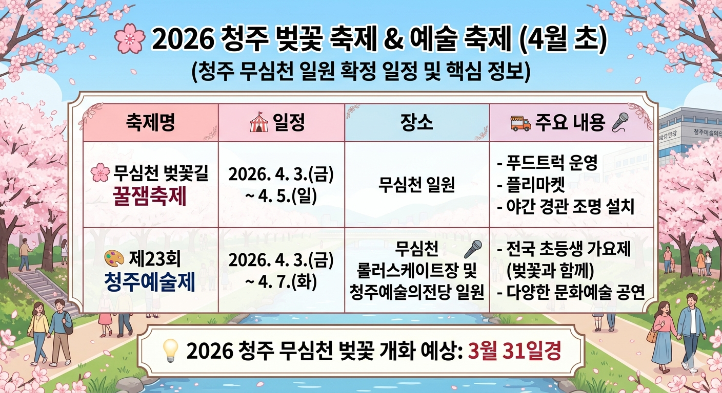 > 💡 방문 팁: 2026년 무심천 벚꽃 개화 예상일은 3월 31일입니다. 축제가 시작되는 4월 3일 전후로 벚꽃이 절정에 이를 것으로 보이니 이 시기를 놓치지 마세요!