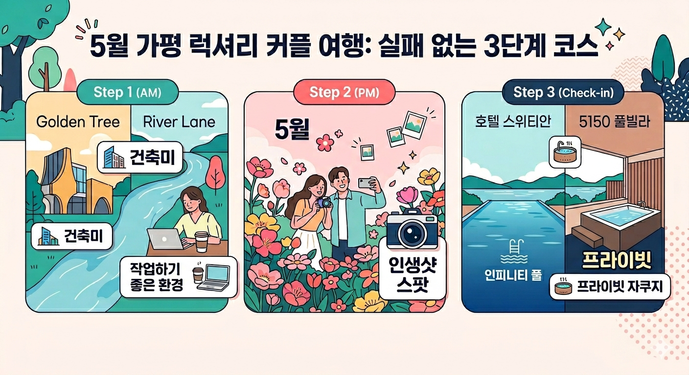 가평의 "럭셔리 풀빌라 파티" 테마에 딱 맞춰, 30대 커플이 후회하지 않을 구체적인 장소와 동선을 정리해 드립니다. 5월의 선선한 바람과 북한강 뷰를 온전히 누릴 수 있는 곳들입니다.